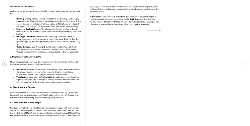 NumPy for high-performance numerical computation and Pandas for essential data loading, cleaning, and Exploratory Data Analysis (EDA). Essential for reliable, shareable, and reproducible scientific results.